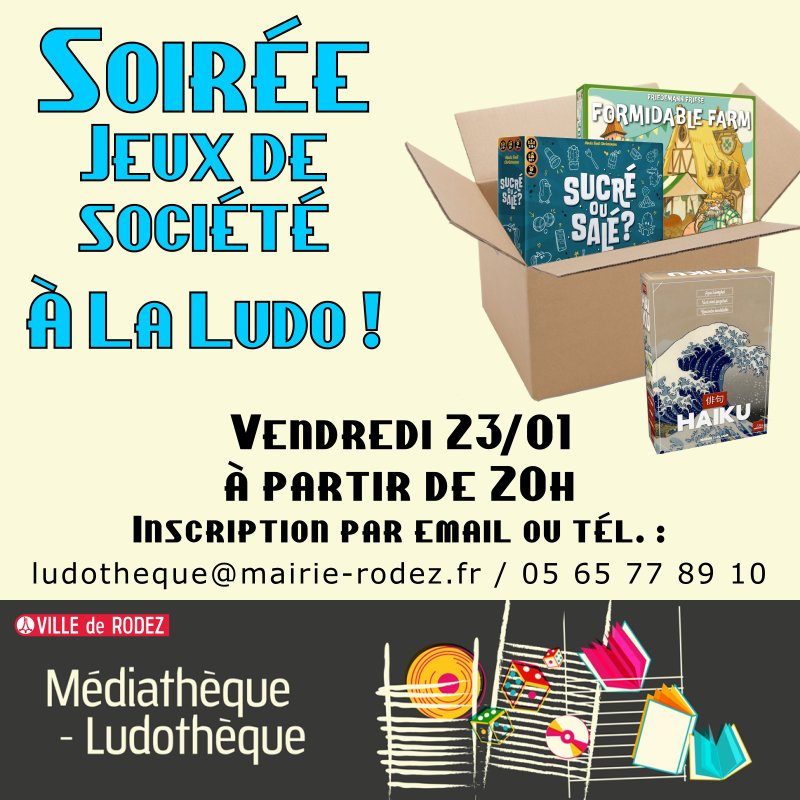 La Ludothèque propose à toutes et à tous une soirée jeux le vendredi 23 janvier 2026 dans le secteur Ludothèque au 1er étage de la Médiathèque à 20h00.