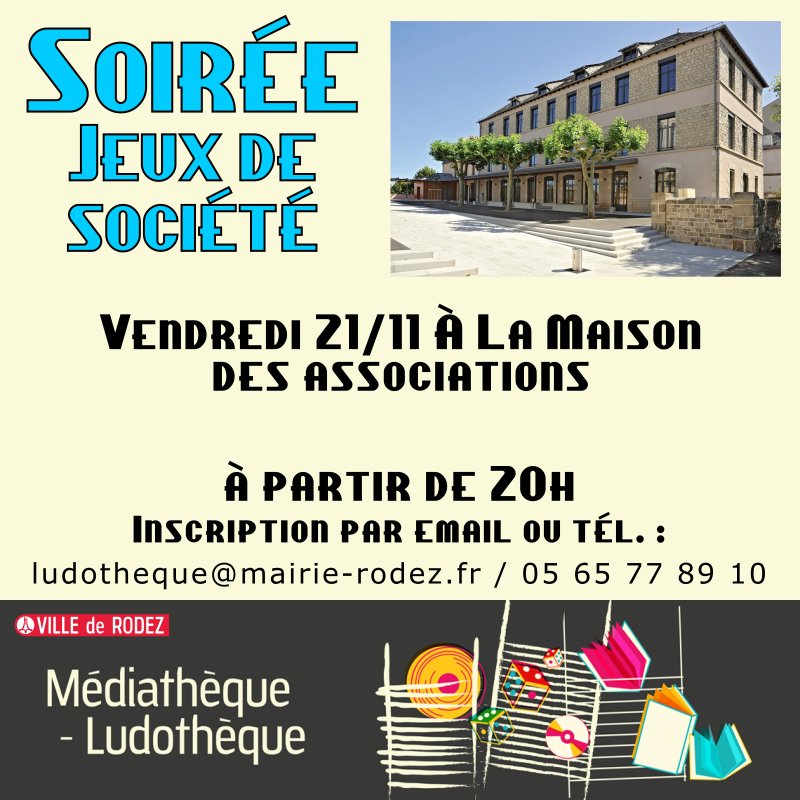 La Ludothèque propose une soirée jeux "hors les murs", dans les locaux de la Maison des Associations du Faubourg, 15 avenue Tarayre le vendredi 21 novembre à 20h00.